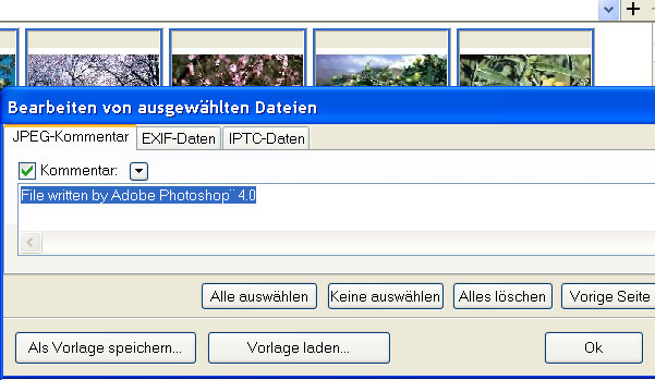 Unter 'EXIF/IPTC' klickt man auf Bearbeiten und sieht dann ein Fenster mit den Reitern JPEG-Kommentar, EXIF-Daten und IPTC-Daten. Man wählt den gewüschten Bereich. In unserm Fall wird neben Kommentar ein Haken gesetzt und der Eintrag gelöscht. Dann klickt man auf den Button 'Alles löschen' und auf 'Ok'. Vor dieser Prozedur kann man beliebig viele Bilder markieren, aus denen die ungewünschten Kommentare gelöscht werden.