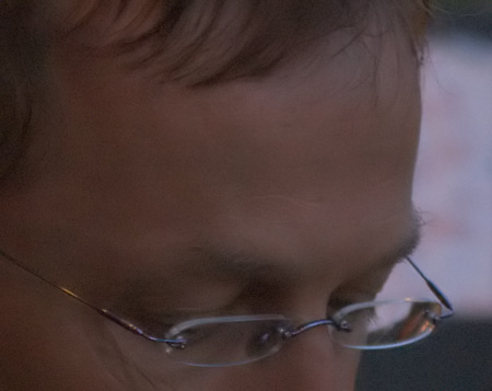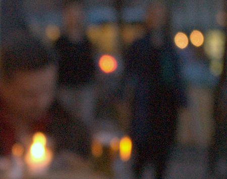 Die Szene wurde mit diversen Kunstlichtquellen und dem spärlichen Restlicht des schwindenden Tages beleuchtet. Die digitale Spiegelreflex Pentax *ist DS war auf ISO 3200 eingestellt.Die vergrößerten Auschnitte zeigen ist eine feinstrukturierte krisselige, falschfarbene Struktur zu sehen, das sogenannte Rauschen. Daneben sieht man Ergebnisse nach der Bearbeitung mit Neat Image.