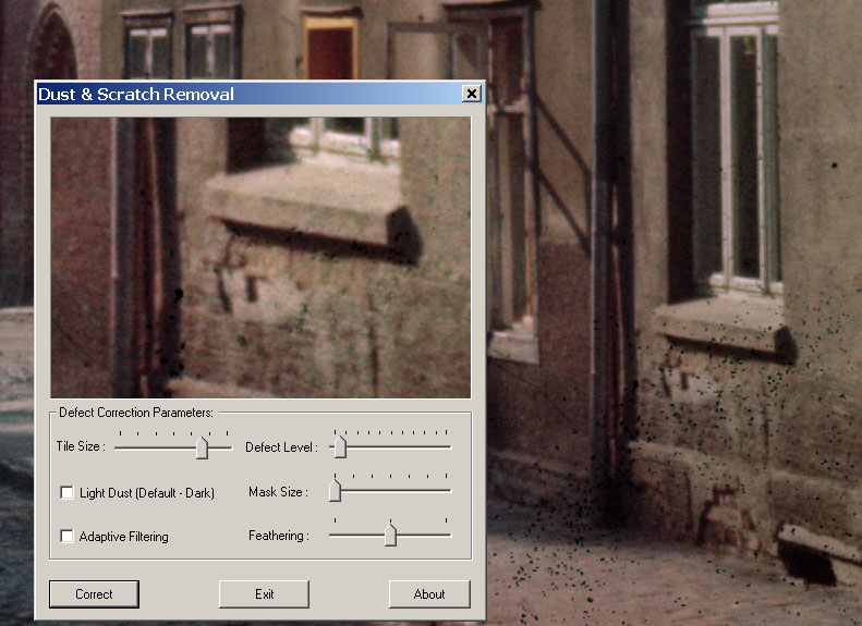 Nachstehend sehen wir ein Beispiel, bei dem das Filter wirkungsvoll schwarze Sprenkel auf einem alten farbigen Dia beseitigt. Es sind keine Kratzer oder Schmutzteile auf dem Film. Daher wurden sie nicht von der ICE-Automatik des Nikon Coolscan 5000 erkannt. Die Punkte sind Defekte im Bild, die wahrscheinlich durch lokale chemische Pozesse entstanden. Man beachte die rechte Seite unten. Die Filtereinstellungen sind auf dem oberen Bild zu sehen. Oft ist es sinnvoll, mehrmals mit der geringsten Stufe zu retuschieren. Hier wurde das Werkzeug nur einmal angewandt. Das Ergebnis ist nicht perfekt, doch sind die wenigen Sprenkelreste leicht per Hand zu beseitigen.