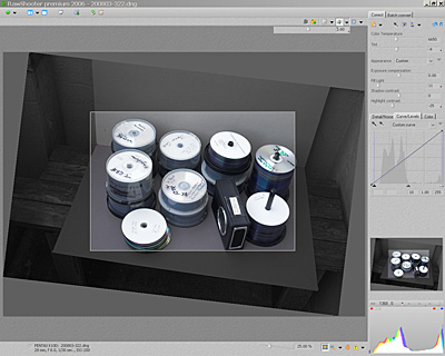 Beim ersten 'Betrachten' eines Ordnerinhalts erstellt RawShooter kleine Abbilder, die sogenannten Thumbnails. Unter 'Preferences' gibt man ein Verzeichnis außerhalb der Systempartition ein, das RawShooter zum Speichern der Thumbnails und Bearbeitungshinweise benutzen kann. Das Programm wird in dem genannten Verzeichnis den Unterordner 'ImageCache' mit den Unterordnern '.RWSettings' und 'Proxy' erstellen. Im letztgenannten werden pro RAW-Datei je eine ca. 1 MB große Datei angelegt. Andere RAW-Konverter machen das auch, beanspruchen aber viel mehr Speicherplatz für die einzelnen Dateien.Mit Hilfe des Browser werden Bilder gedreht, gelöscht, markiert etc. Ein Doppelklick auf ein Bild öffnet es. Das geht ziemlich schnell und alle Kovertierungsvorgaben werden an einem Vorschaubild durchgeführt und angezeigt. Die Erstellung der Tiffs oder JPEGs nach den eingegebenen Voreinstellungen findet später mit einer Stapelverarbeitung statt.