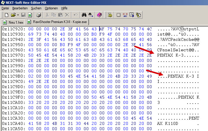 Im Hex-Editor sieht man rechts die aufgeführten Pentax-Modelle. Die Pentax K-3 und Pentax K-3 II wurden eingetragen.