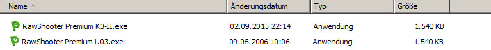 Die modifizierte Datei muss exakt dieselbe Dateigröße haben wie das Original. Hat alles korrekt funktioniert, steht im Explorer vor dieser Datei dasselbe grüne Symbol wie beim Original. Falls nicht, wiederholt man den Vorgang und gibt nach 'Pentax K-3' noch ein Leerzeichen ein oder löscht eines. Es ist wichtig, dass die Gesamtanzahl der Zeichen in der Datei unverändert bleibt! Die originale und die manipulierte 'RAWShooter.exe' können gemeinsam im Programmordner bleiben. Man legt sich eine Verknüpfung zu der 'RawShooter-K-3.exe' auf den Desktop und ist arbeitsfähig.