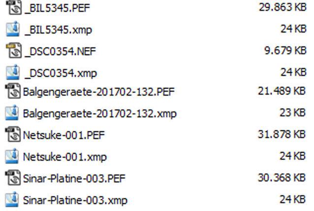Pro Bild gibt es somit zwei Dateien. Ändert man den Namen einer Rohdatei, muss man auch den Namen der .xmp Datei ändern. Verschiebt man eine Rohdatei, muss man auch die .xmp Datei (oder andere Endung) verschieben.