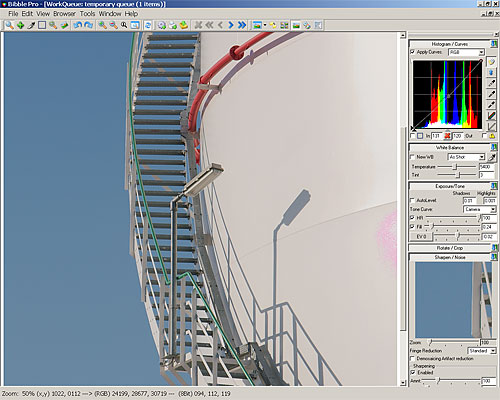 Preis (2005): Bibble Pro - 129 $, Bibble lite - 69$Bibble Pro enthält viele Instrumente, wie zur Korrektur der Vignettierung oder zur Beseitigung von Farbsäumen, Noise Ninja und weitere. Bibble Pro 4.9 hat eine ordentliche Automatikfunktion, mit der verhältnismäßig viele Fotos ohne langwierige individuelle Voreinstellungen akzeptabel konvertiert werden. Man muss sich mit diesem Programm vertraut machen, um bestmögliche Ergebnisse zu erzielen. Da RawShooter nicht weiter entwickelt wird, wäre Bibble Pro eine gute, preislich attraktive Alternative.