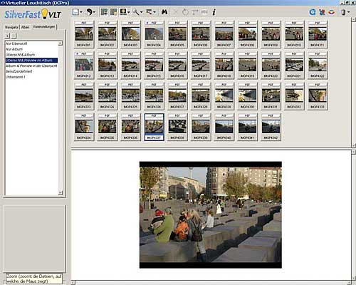 SilverFast DC hat zwei Arbeitsflächen. Zum einen gibt es den virtuellen Leuchttisch, der Bilder in einem Ordner als nebeneinanderstehende Miniaturansichten zeigt. öffnet man ein einzelnes Bild zur Konvertierung, erscheint die typische SilverFast-Oberfläche mit einem Preview und den Optionen.