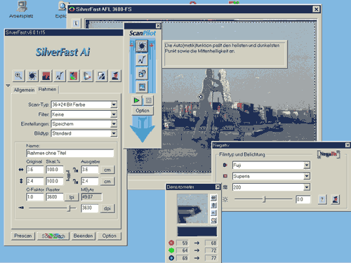 Das Erscheinungsbild von SilverFast Ai 6 aus dem Jahre 2002 ist chaotisch. Beim Start öffnen sich mehrere übereinander liegende Fenster. Man muss sie auf dem Bildschirm sortieren, um einen Überblick zu gewinnen. Die vielen Einstellungen und Optionen des Programms müssen irgendwie ereichbar sein. Es gibt Icons und Abkürzungen, die nicht sofort verständlich sind. Der Sinn des Werkzeugs ScanPilot, im Prinzip ein Fortschrittsbalken mit Auflistung der Schritte, erschließt sich mir nicht.