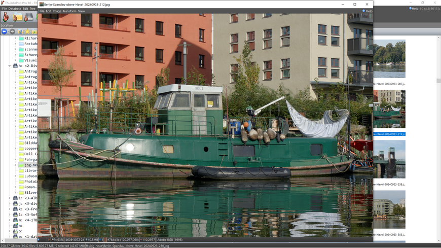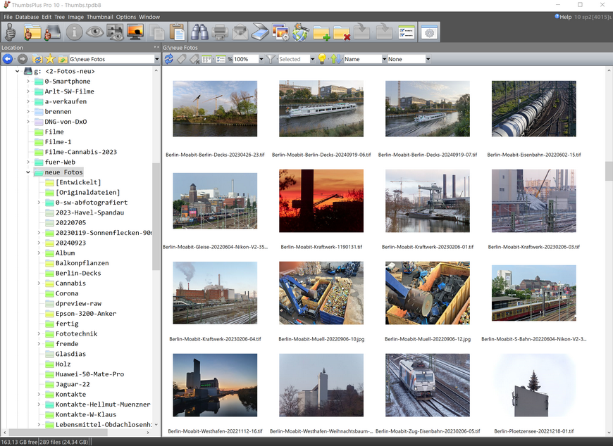 2024 © Thomas GadeThumbsPlus 10 ist ein sehr gutes und ausgereiftes Programm zur Bildverwaltung. In der linken Spalte kann man Speicher auf Computern und im Netzwerk durchsuchen, Ordnerinhalte öffnen und anzeigen, nach Dateien suchen, Dateien mit Schlüsselwörtern versehen, Dateien Galerien zuweisen, gefundene Listen anzeigen, Galerien anzeigen und Zip-Dateien als Ordner anzeigen. Im Hauptfenster sind die Bilder als Thumbnails (Miniaturansichten) oder als Listen zu sehen. Dienste, wie das Erstellen von Miniaturansichten, Stapelverarbeitung, Drucken von Bildverzeichnissen können vor hier ausgeführt werden.