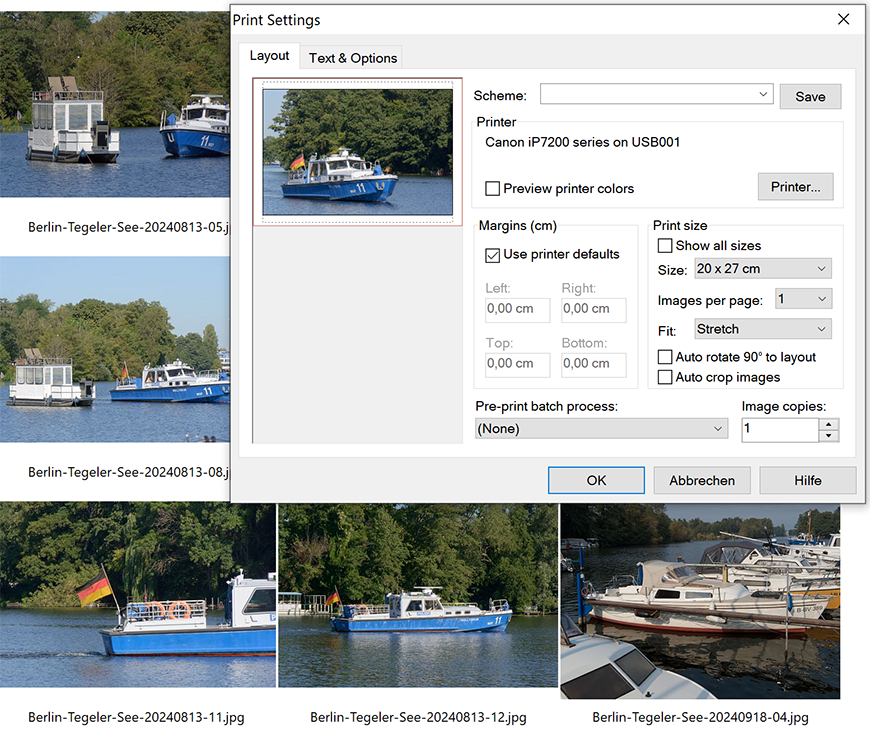 Eine oder mehrere Bilder können mit oder ohne Ränder und Textinformationen gedruckt werden. ThumbsPlus bietet auch die Möglichkeit, Kataloge mit vielen Bildern zu drucken. Zu jedem Bild können Informationen in Kopf- und Fußzeilen gedruckt werden.