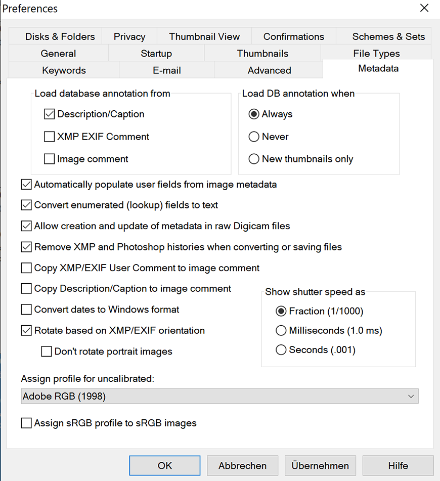 Darüber hinaus müssen die Datenbanken irgendwo gespeichert sein. Sie enthalten nicht nur Dateinamen nebst dem Pfaden zu den betreffenden Bildern, sondern auch kleine Vorschaubilder (Thumbnails) und Kopien der jeweiligen Metadaten. Solche Datenbanken können bei umfangreichen Bildermengen ziemlich groß werden. Insbesondere wenn mit Displays gearbeitet wird, die selber sehr hochauflösend sind, zum Beispiel 4K-Bildschirme. Für diese müssen die Vorschaubilder größer sein als für Displays mit weniger Pixeln. Es ist daher wichtig, den Speicherort solche Datenbanken so festzulegen, dass sie nicht in der Systempartition beim Betriebssystem und den anderen Programmen gespeichert werden. Bei jeder guten Software zur Bildverwaltung kann der Speicherort für Datenbanken beliebig festgelegt werden.