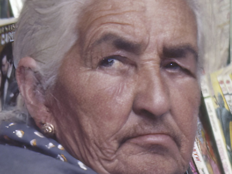 1964. Zeitungsverkäuferin in Portugal. 6x6 Diapositiv. Freihändig fotografiert mit einer zweiäugigen Rolleiflex. Die Abbildungsqualität ist ordentlich und entspricht etwa dem, was man von der damaligen Technik erwarten konnte.