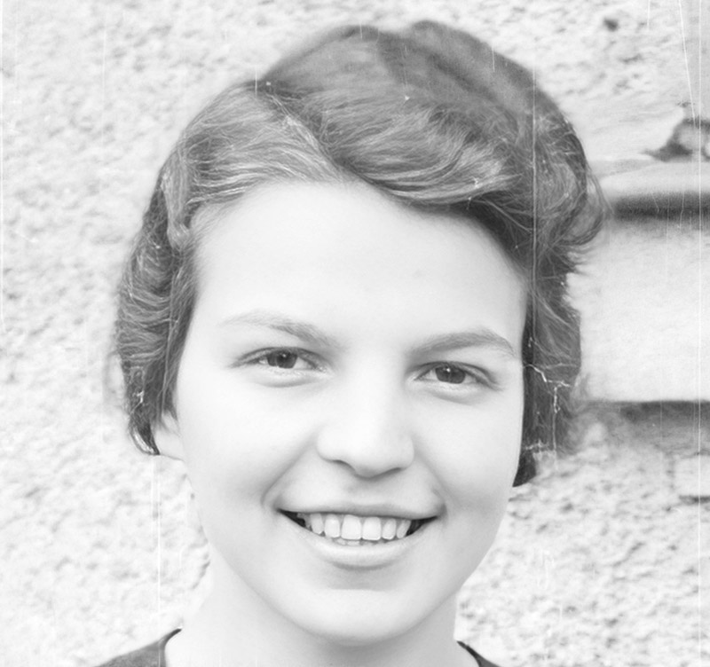 Ausschnitt. Gesicht der jungen Frau. Ergebnis Rekonstruktion durch Topaz Photo Ai. Die Haare um das Gesicht wurden neu gezeichnet, nicht jedoch der hintere Teil des Schopfes. Leider erkennt und beseitigt das Programm die Kratzer nicht.