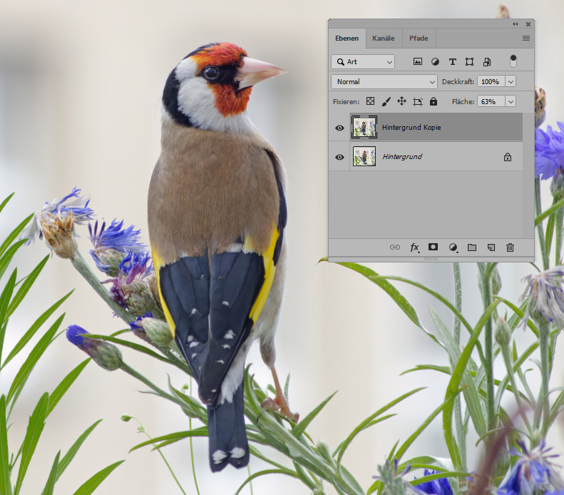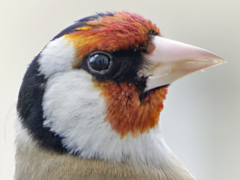 Ausschnitt vom Kopf des Stieglitz aus dem Foto. Verbessert mit Topaz Photo Ai 2. Die effektive Rauschreduzierung und erheblich verbesserte Detailzeichnung sind verblüffend. Man fragt sich, wie weit diese technologische Entwicklung auf die Spitze getrieben werden kann und wie solche Optimierungen zustande kommen. Werden Mikrodetails hinzu erfunden, oder lassen Sie sich tatsächlich durch fortschrittlichere Interpretationen der Dateien herausarbeiten?