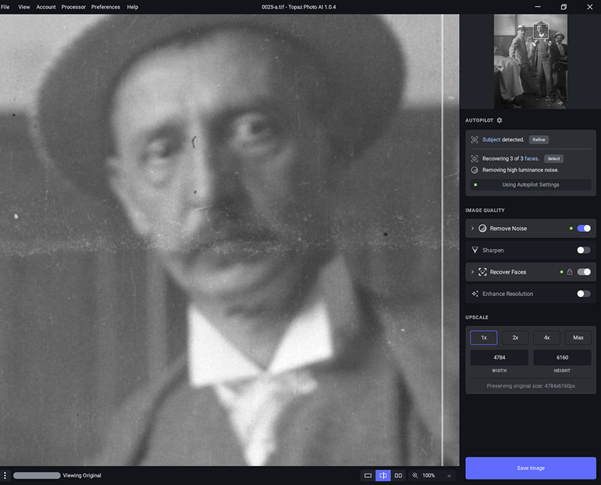 Topaz Photo Ai 1.0.4. Ausschnitt mit Gesicht eines Mannes nach der Bearbeitung. Woher stammen die Details?