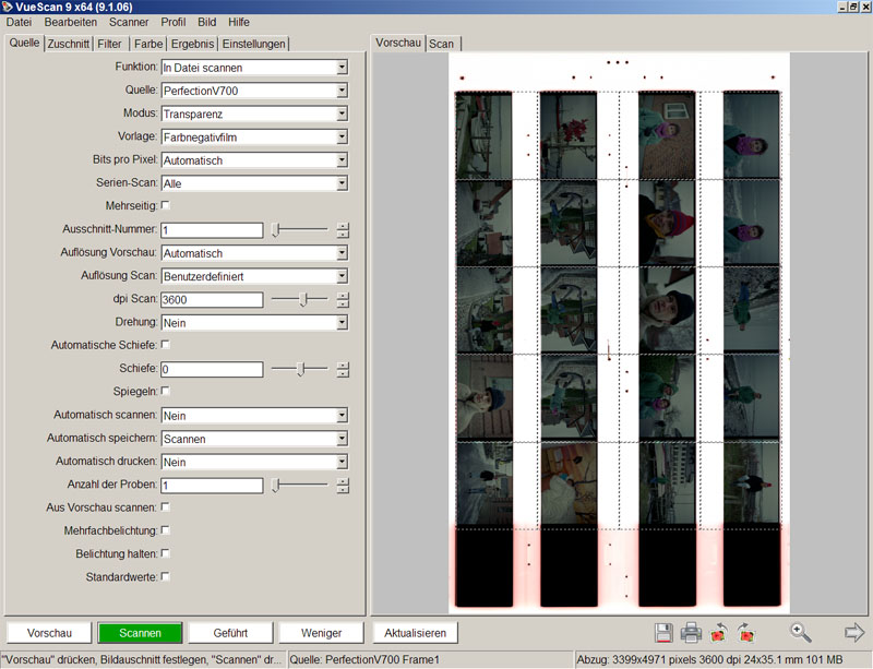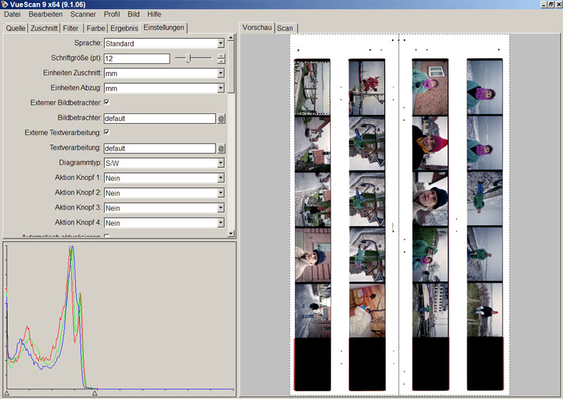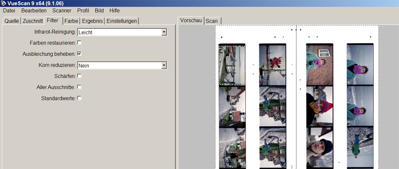 | Größe X / Y | Die sind die Maße der Ausschnitte, die VueScan für jedes Bild anbietet. Die konkreten Ausschnitte für jedes Bild können in der Vorschau mit der Maus separat verändert werden. |