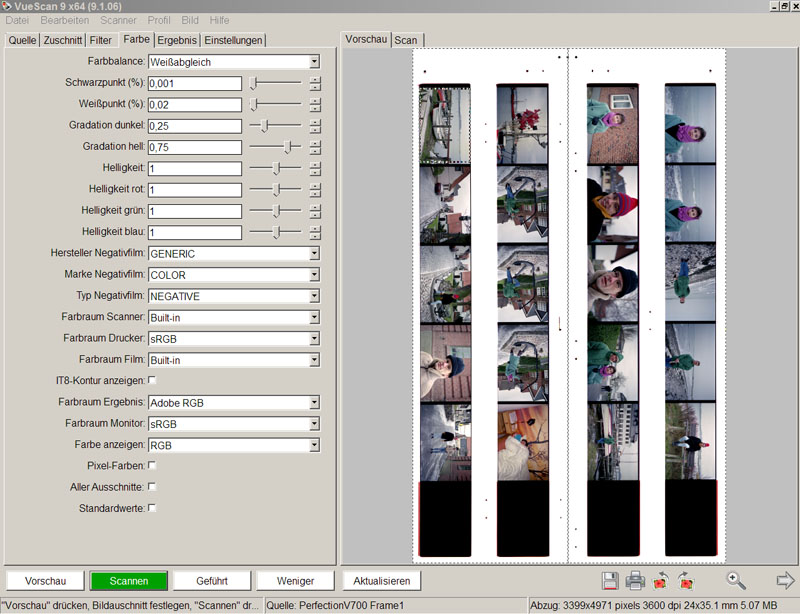 Im Register 'Farbe' sind Filmprofile wählbar. Mit 'GENERIC', 'COLOR' und 'NEGATIVE' gelingen die meisten Bilder. Das Einstellen eines bestimmten Filmtyps führt selten zu einem guten Ergebnis. Man muss es ausprobieren. Viele alte Filme sind bereits farbstofflich verändert. Daher nützen die Profile wenig. Als Farbraum Ergebnis wird sRGB oder Adobe RGB eingestellt. Der Farbraum Adobe RBG ist größer als sRGB. Der Weißpunkt steht standardmäßig auf 1. Der Wert 0,2 ist sicherer, um Tonwertverluste zu vermeiden.