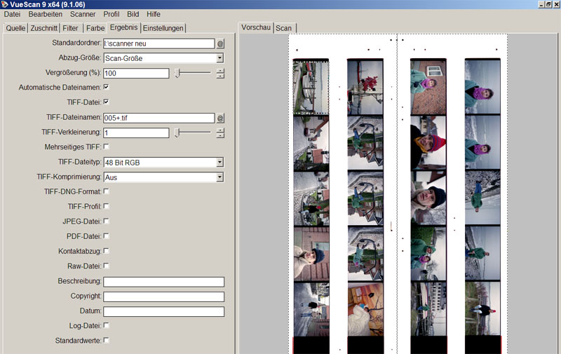 | Dateinamenvergabe mit VueScan Man kann alle Dateinamen manuell eingeben oder dieses mit VueScan automatisieren. VueScan kann ausgehend von einer Nummer fortlaufend die nächsten Nummern als Namen vergeben. Wenn das Zeichen '@' in einem Dateinamen benutzt wird, werden Dateinamen im Format 'Scan-YYMMDD-0001+' benutzt (YY=Jahr, MM=Monat, DD=Tag). Die letzten Ziffern werden erhöht, bis ein nicht genutzter Dateiname gefunden wird. Pluszeichen Man kann einen beliebigen Dateinamen vorgeben. Beispielsweise 'Film01-01.tif' In dem Fall steht Filmo1 für den 1. Film und die letzte o1 steht für die Bildnummer. Setzt man dahinter ein ' + ', zählt Vuescan automatisch weiter. Die Eingabe lautet dann: 'Film01-01+.tif. VueScan wird beim Speichern des zweiten Bildes automatisch den Namen 'Film01-02.tif' vergeben. Man beachte: Wird eine Datei aus einer existierenden nummerierten Serie entfernt, wird die nächste gespeicherte Datei diese offene Stelle ausfüllen. Das wird vermieden, indem man nachsieht, welche Nummer zuletzt vergeben wurde. Lautet der letzte Dateiname 'Film03-29.tif' und wird vom selben Film weitergescannt, gibt man 'Film03-30+.tif' ein. VueScan vergibt keine davor liegende Nummer. Wenn mehr als ein Pluszeichen eingegeben wurde, wird VueScan nur das letzte Plus für dieses Verfahren berücksichtigen. Asterisk- / Sternchenzeichen Dateinamen von Rohdaten werden nicht verändert, wenn ein ' Gleichheitszeichen Ein Gleichheitszeichen ' = ' im Dateinamen veranlasst VueScan, beim Speichern die Eingabe unter „Input|Frame number' an dieser Stelle einzusetzen. Wenn dasselbe Einzelbild mehr als einmal gespeichert wird, überschreibt VueScan die vorherige Datei (Vgl. 'Prefs|Warn on overwrite'). |