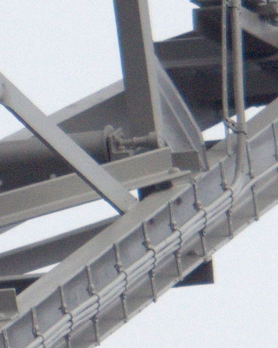 Wir verglichen die Schärfe und Detailzeichnung der SIGMA sd Quattro mit einer Pentax K-3. Beide Kameras wurden über ein Balgengerät mit dem gleichen Schneider-Kreuznach Xenar 105mm bei Blende 8 belichtet. Die Struktur eines Krans war bei trüben Wetter das Testmotiv. Die SIGMA sd Quattro erzeugt ein Bild mit 5424 x 3616 px gegenüber 6016 x 4000 px der Pentax K-3. Zum Vergleich wurde die Datei der SIGMA sd Quattro auf 6016 x 4000 px hochskaliert.In beiden Fällen wurde im RAW Modus fotografiert.