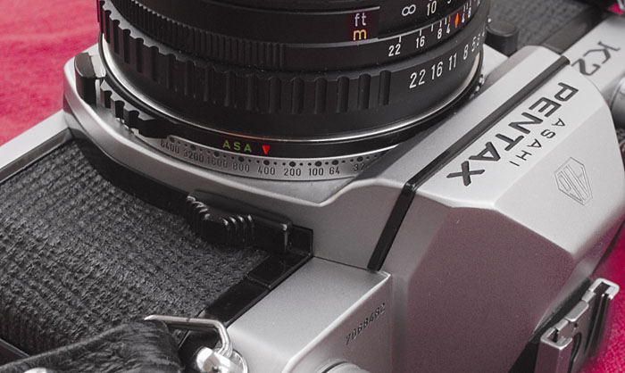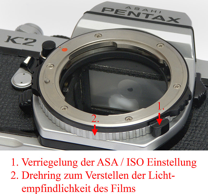 Die Einstellung der Filmempfindlichkeit wird an der Asahi Pentax K2 mit einem Ring um das Objektivbajonett eingestellt. Man muss zuerst die Belichtungskorrektur auf 1x stellen.Dann drückt man auf die Entriegelung und kann anschließend mit dem Fingernagel den darunterliegenden Ring im gerändelten Bereich drehen. Am besten übt man das ohne Objektiv an der Kamera.