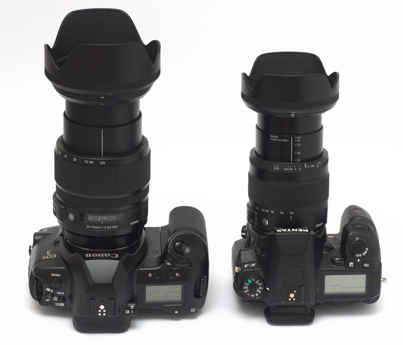 Größenvergleich: Canon EOS 3 mit Sigma 24-105mm Zoom neben einer Pentax K-3 mit einem Sigma 17-70 mm Zoom. Die Canon wiegt in der Kombination ca. 1,8 Kilo und die Pentax mit ihrem kompakteren Zoom rund 1,2 kg. Zudem ist die Pentax kleiner.