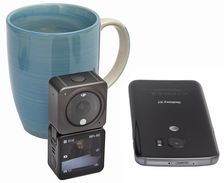 Größenvergleich: DJI Action 2 mit Touchscreen-Modul neben einem Smartphone und einer Tasse