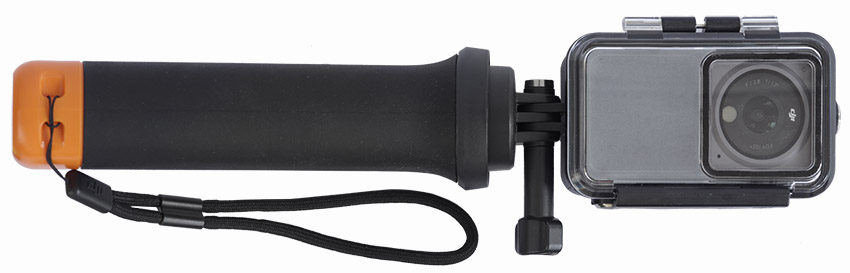 Handgriff mit Handschlaufe und wasserdichtem Gehäuse, in der sich die DJI Action 2 und ein Akku Modul befinden. Keine schlechte Ausstattung zum Schorcheln in niedrigen Wassertiefen, die noch genügend Licht von der Sonne durchlassen. Wenn man bei klarem Wasser und hochstehender Sonne Tauchtiefen zwischen 10 und 60 Metern ausnutzen möchte, benötigt man zusätzliche Lichtquellen.