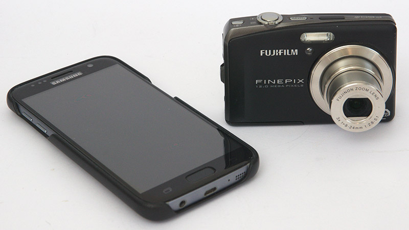 Fujifilm Finepix F60fd neben einem Samsung S7 Smartphone