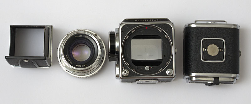 Hasselblad 500 C Spiegelreflexkamera: Lichtschacht, Objektiv, Gehäuse, Magazin