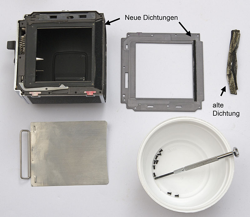 Der Schaumstoff der Lichtdichtungen des Magazin ist nach vielen Jahren häufig zu einer schmierigen, klebrigen Substanz geworden sein. Sie sind leicht auszutauschen. Dazu schraubt man den Blechrahmen über die Führung des lichtdichten Schiebers ab. Danach liegen die alten Dichtungen frei. Mit einem Messer werden sie abgeschabt und die klebrigen Reste lassen sich mit Xylol abwischen. Ein dünner samtartiger Stoff dient als Ersatz. Um die kleinen Schrauben nicht zu verlieren, legt man das Magazin beim Auseinandernehmen und Zusammenschrauben am besten in eine Schüssel oder Plastikwanne, damit sie beim Abfallen in dem Behälter bleiben und leicht gefunden werden können. Die Arbeit ist nicht schwer, verlangt aber ein gewisses Maß an handwerklichem Geschick und ein Gespür für das Material, um keine Schäden zu bewirken. An die Beschaffung geeigneten Dichtungsmaterials ist vorher zu denken.