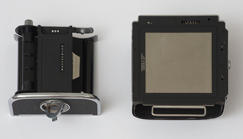 Rechte Seite der Hasselblad 500 C. Sie wirkt schlicht und sogar langweilig. Am Bügel des Schiebersvor dem Magazin ist erkennbar, ob dieser Lichtschutz eingesetzt ist. Nur dann kann man das Magazin mit einem teilbelichteten Film abmachen. Anderenfalls würde man ein Stück des Films bei Magazinwechsel den Licht aussetzen und damit verderben. Beim Gebrauchtkauf einer solchen Kamera ist darauf zu achten, dass jedes Magazin mit einem Schieber ausgestattet ist.