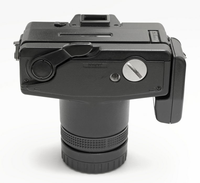 An einer Seite befindet sich ein entfernbarer Handgriff. Grundsätzlich hat sich die Bedienung gegenüber der Vorgängerin nicht geändert. Nach Vorwahl der Blende stellt die Belichtungsautomatik die Verschlusszeiten ein. Die längste beträgt nur noch 1/4 s anstatt 10 s beim Vormodell. Auch bei der Mark II befindet sich der Spannhebel auf der Unterseite des Gehäuses.