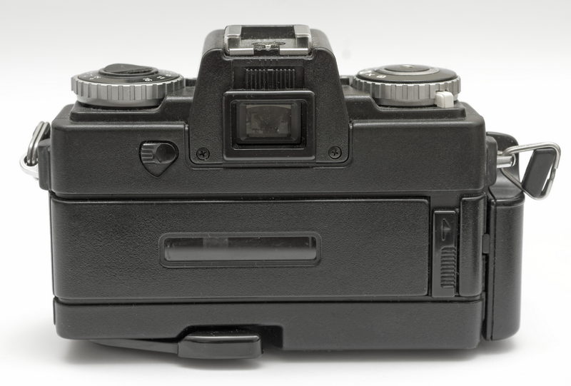 Rückseite mit geschlosserner Klappe. Über dem Suchereinblick ist der verschiebbare Hebel für die Dioptrienkorrektur erkennbar. Links neben dem Sucher befindet sich ein Hebel zum Verschließen des Einblicks für Langzeitbelichtungen.