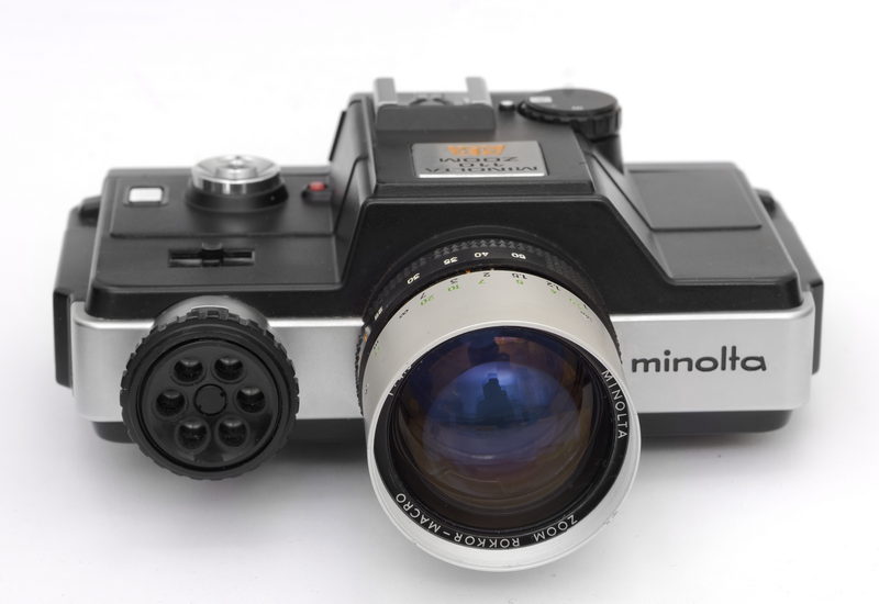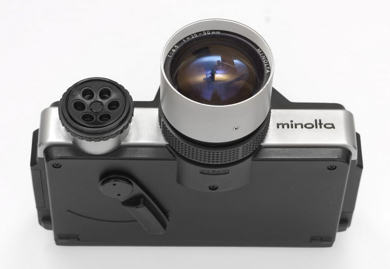Das fest eingebaute Objektiv Zoom Rokkor-Macro 25–50 mm f/4,5–16 entspricht kleinbildäquivalent einem Zoomobjektiv mit 50-100 mm Brennweite. Es wird manuell von 1 m bis unendlich fokussiert. In Makrostellung verringert sich die Naheinstellgrenze auf 28 cm.