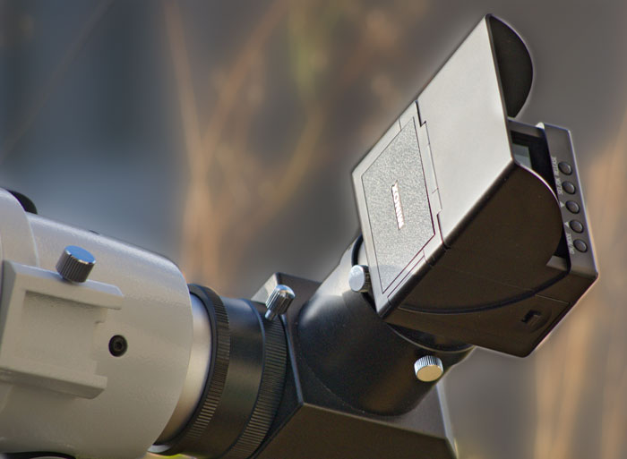 Minox DCM 5.0 auf einem 2" Zenitspiegel an einem Teleskop. Die kleine Kamera entspricht einem digitalen Okular.