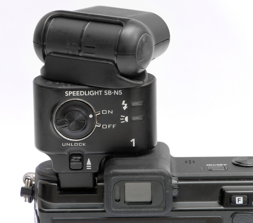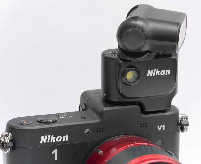 Das SB-N5 ist geradezu winzig und benötigt keine Batterien. Es wird aus dem Kameragehäuse mit Strom versorgt. Im ersten Moment scheint das paradox zu sein, zumal die V2 und V3 eingebaute, ausklappbare Blitzgeräte enthalten. Die V1 hat aber keines an Bord.
