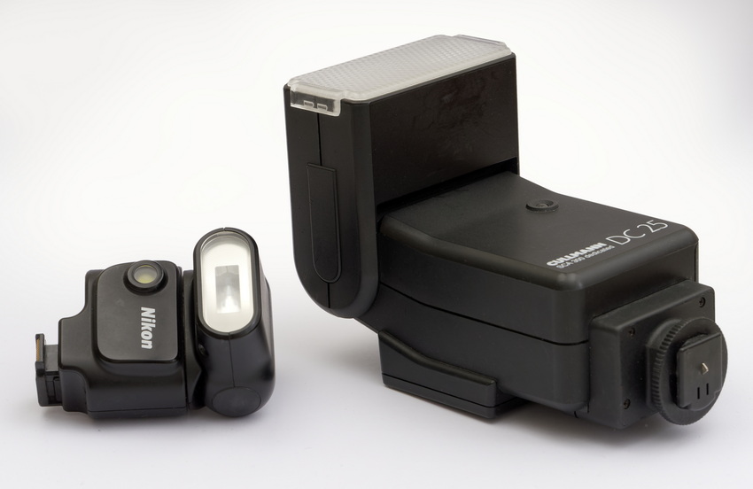 Größenvergleich: Das kleine Nikon Speedlight SB-N5 neben einem Cullmann DC 25 im typischen Format üblicher Blitzgeräte für Spiegelreflexkameras oder digitale Systemkameras.