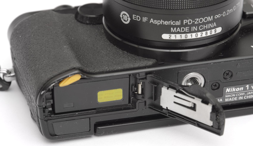 Während die Bodenklappe bei den anderen Nikon 1 Kameras einen Schacht verschließt, in dem der Akku und die Speicherkarte Platz haben, befindet sich in der V3 darin nur der Akku.