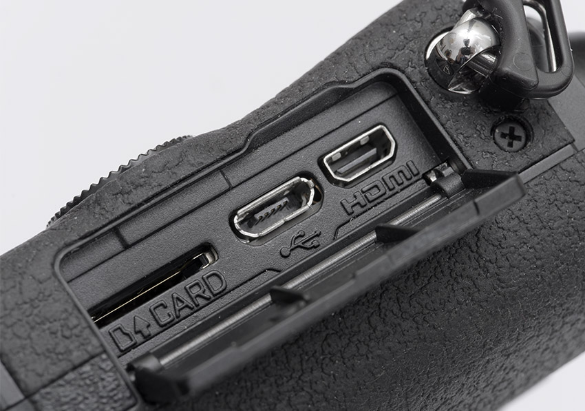 Als Speichermedium nutzt die Nikon V3 eine microSD Karte. Diese Mini SD Karte passt in einen schmalen Schlitz neben die Buchsen USB- und HDMI-Kabel. In der Praxis ist diese winzige Karte gar nicht so leicht zu handhaben und kann schon beim Herunterfallen auf Nimmerwiedersehen verschwinden, wenn sie in einer Dielenritze oder zwischen Grashalmen landet.