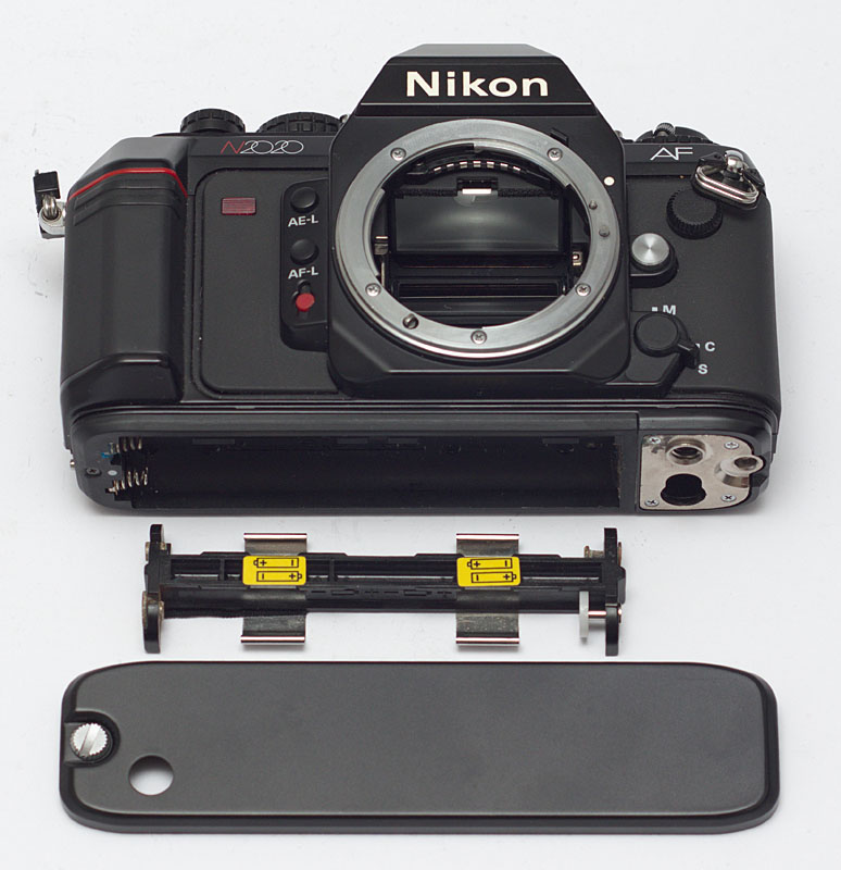 Die Nikon F-501 / N2020 bezieht ihren Strom aus vier AAA Batterien über der abnehmbaren Bodenplatte. Beim Gebrauchtkauf sollte man den Deckel abnehmen, um zu prüfen, ob Batterien in der Kamera ausgelaufen sind. In dem Fall wären das Fach und der Batteriehalter zu reinigen.