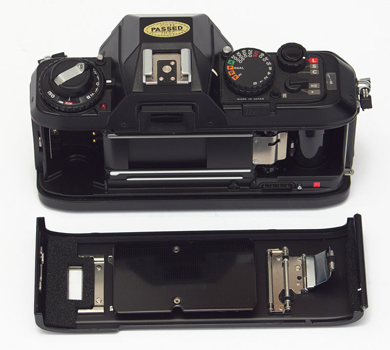 Die Rückwand der Nikon F-501 ist abnehmbar, um stattdessen ein Data Back (Rückwand mit Datumseinblendung) anzumontieren. Die Haken zum Verschließen der Rückwand sind aus Metall und können nicht abbrechen.