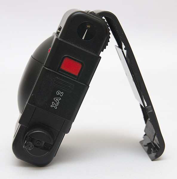 Olympus XA 2 mit geöffneter Abdeckung. Das Objektiv und die ISO Einstellung sind sichtbar. Darunter befindet sich ein Hebel für einen optionalen Blitz, der als Zubehör erhältlich ist.