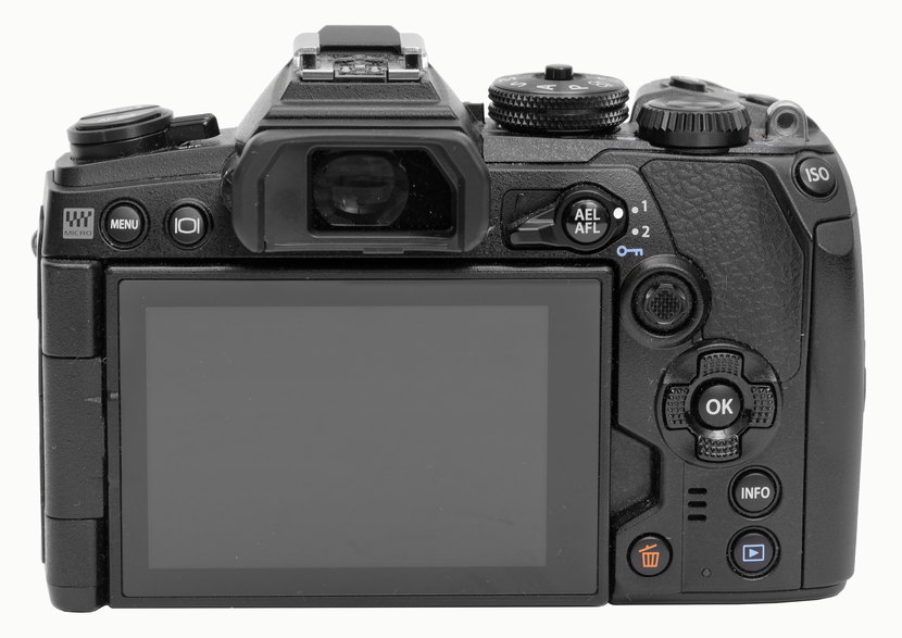Rückseite der Olympus OM-D E-M1 III mit ausklappbaren und drehbaren Touchscreen.