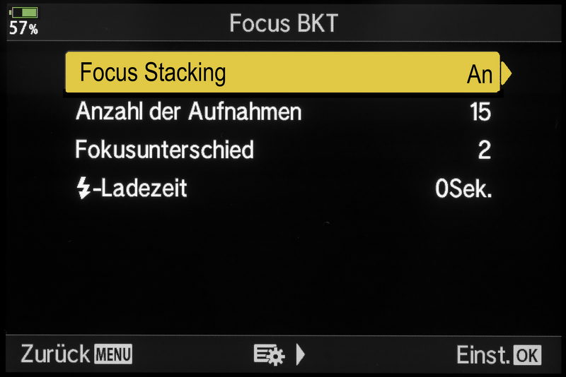 Das Verrechnen der Bilder heißt Focus Stacking. Auch das kann die Olympus OM-D E-M1 III. Beim Focus Stacking wird das Motiv ungefähr mittig anvisiert und ausgelöst. Danach sucht die Kamera selber eine Stelle im Vordergrund, um von dort aus die Schärfe während der Aufnahmeserie allmählich in den Hintergrund zu verlagern. Mit der Olympus OM-D E-M1 III können maximal 15 Bilder aufgenommen werden, wenn Focus Stacking eingestellt ist. Focus Stacking dauert eine Weile, während der die Kamera für weitere Aufnahmen ausfällt.