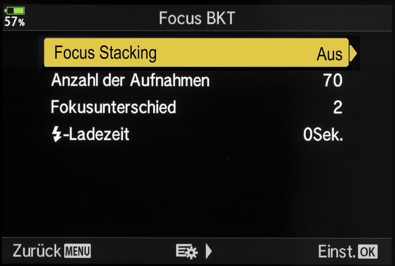 Wenn die Schärfentiefe eines einzelnen Fotos in der Makrofotografie trotz kleiner Blende nicht reicht, wird das Motiv mehrmals nacheinander mit fortlaufend leicht veränderter Fokussierung aufgenommen. Anschließend kombiniert eine Software die verschiedenen scharfen Bereiche aus allen Fotos zu einem Ergebnis mit großer Schärfentiefe.Focus Bracketing