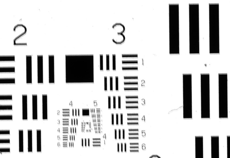 Zu sehen ist ein winziger Ausschnitt aus einem USAF-1951-Resolution-Testdia.