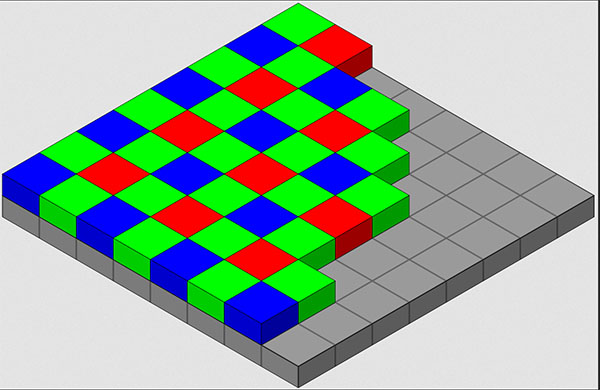 Die Pixel eines Sensors können keine Farben messen, sondern lediglich die Lichtstärke während der Belichtungszeit. Um Farben zu definieren, befindet sich eine Bayer-Matrix vor dem Sensor. Schachbrettartig liegen darauf winzige Grün-, Blau- und Rotfilter nebeneinander. 50% davon sind grün und jeweils 25% rot und blau. Vor jedem Pixel befindet sich genau einer dieser Filter. Ist er grün, dann misst das Pixel dahinter die Stärke des grünen Lichtes während der Belichtung. Analog gilt für rot und blau.