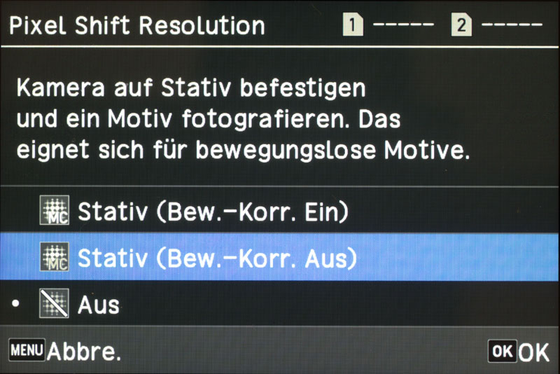 Pixel Shift Resolution wird im 4. Register neben dem oberen Pictogramm (Kamera) eingestellt.