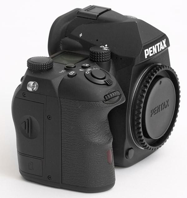 Oberseite der Pentax K-3 III. Erst nach der Bildbearbeitung fiel mir auf, dass die Belichtungsautomatik AV für ISO 6400 bei aufgesetztem schwarzen Deckel und verschlossenem Suchereinblick (durch Auflage auf dem Tisch) 0,6 Sekunden Belichtungszeit einstellte. Wäre mir das vorher nicht entgangen, hätte ich das Foto mit einem anderen Deckel wiederholt, um zu prüfen, ob der erste etwas Licht durchließ, ev. in Infrarot nahe dem sichtbaren Spektrum, das noch die Belichtungsmessung beeinflusste.