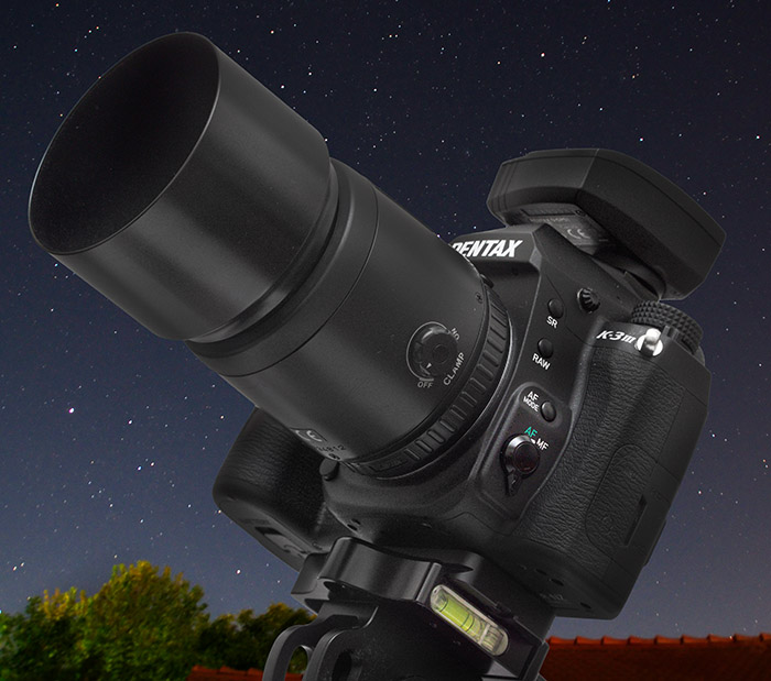 Pentax K-3 III mit optionalem GPS-Modul O-GPS1 zur Astrofotografie.