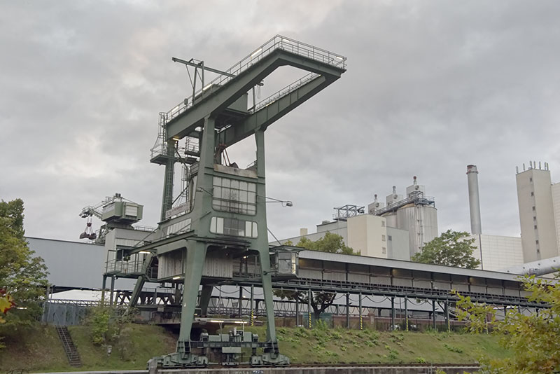 Kraftwerk Moabit in der Abenddämmerung mit Wolkendecke.