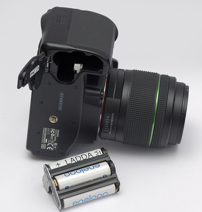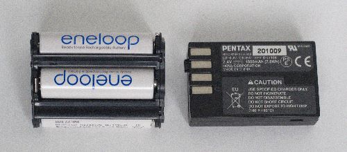 Bei der Verwendung der Pentax K-r ist eine Stromversorgung mit vier Eneloop-Akkus empfehlenswert und dem zur Kamera gehörenden Akku vom Pentax deutlich überlegen. Der Pentax-Akku macht in der Praxis den Eindruck eines Hilfskonstrukts, das viel zu schnell leer ist, während die Eneloops reichlich Strom liefern.